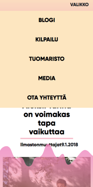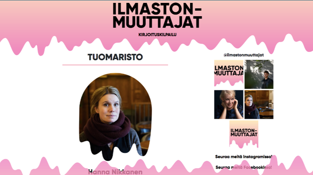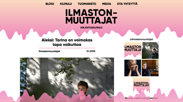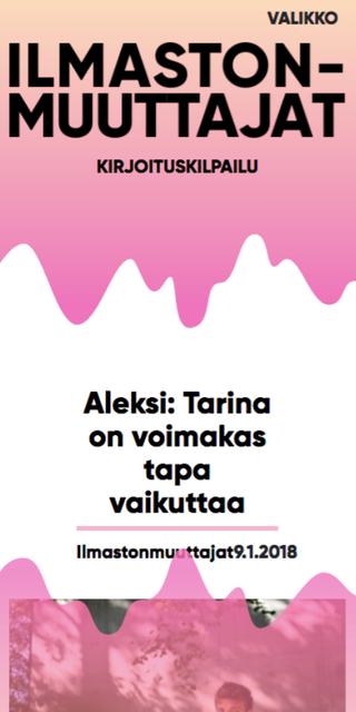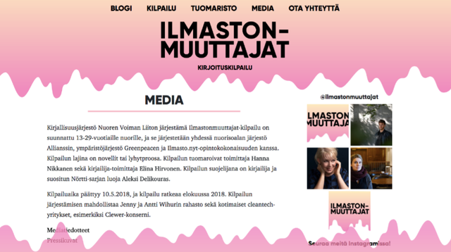 Ilmastonmuuttajat on Nuoren Voiman Liiton järjetämä kirjoituskilpailu 13–29- vuotiaille. Suunnittelimme ja toteutimme yhdessä Wolf Wikgrenin kanssa kilpailun ulkoasun sekä verkkosivun. Ulkoasu haluttiin säilyttää tarkoituksellisen abstraktina, ilman selkeää viittausta esimerkiksi luontoon. Myös värin toivottiin olevan muu kuin vihreä. Päädyimme räväkän pinkkiin toteutukseen, joka näyttää joko sulavalta jäätelöltä, jäävuorilta tai joltain ihan muulta katsojasta riippuen. Sivun alaosan aaltoileva elementti on koko ajan näkökentässä päällimmäisenä – ilmastonmuutoksen tavoin sitä ei voi jättää huomioimatta.